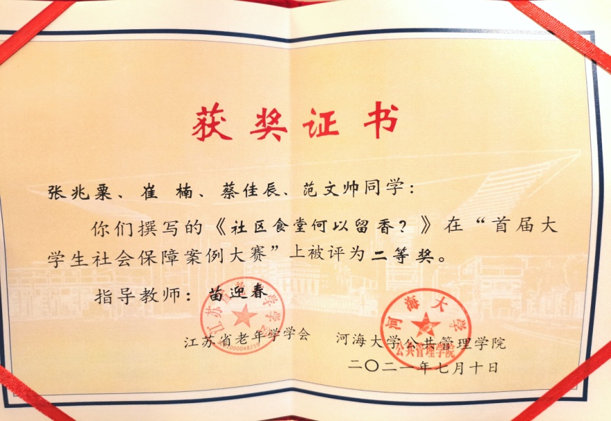 苗迎春老师指导的2020级社会保障研究生团队荣获二等奖,团队成员张兆粟、崔楠、蔡佳辰、范文帅赴宁参加颁奖典礼。