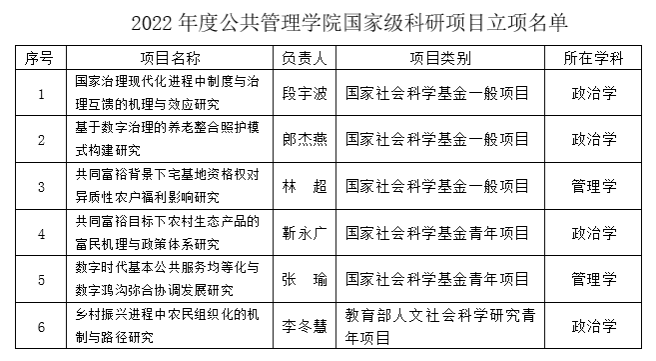 近年来,欢乐麻将app 度重视国家级科研项目申报工作,每年及时对项目申报工作进行充分动员,并对项目申报工作提供精准指导和服务。今年李冬慧博士获批教育部人文社科青年项目1项,至此欢乐麻将app 2022年共获批国家级科研项目6项。欢乐麻将app 在国家级科研项目立项上取得重要突破,必将有力推动全院科研实力大幅提升,促进公共管理学科建设提档升级。