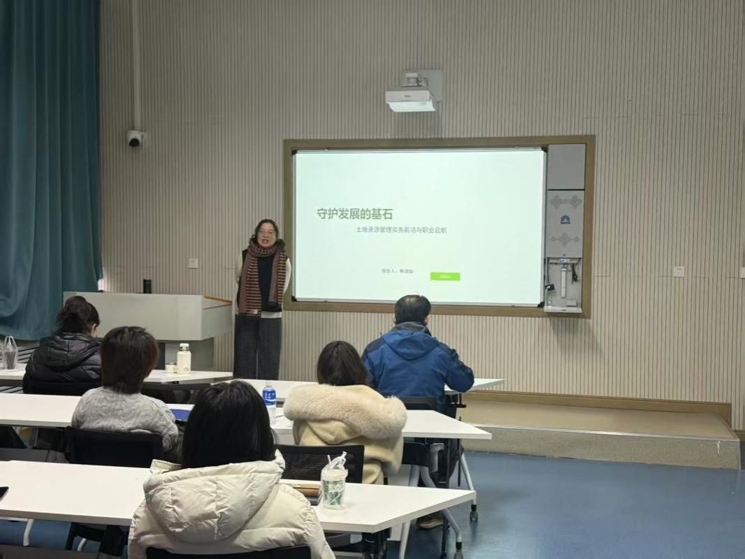韩润仙主任首先从土地的自然、经济、社会、生态与环境四重属性出发,系统阐释了土地资源和土地管理的重要性。其次,韩主任重点解读了我国国土空间规划的核心体系-“四梁八柱”,强调国土空间规划在实现多规合一、优化国土开发保护格局中的关键作用;以及对国土空间规划未来发展趋势进行了展望,她认为未来国土空间规划体系将更加精细化,管理更加数字化和智能化,更加注重绿色发展与生态修复。其次,韩主任结合山西国土空间规划的前沿,详细讲述了乡镇规划的定位﹑基础和编制要点,她指出乡镇规划作为规划体系的基层单元,承担着落实上位规划、衔接乡村振兴与本地发展需求的重要职能,其编制应注重底线约束、特色引导与实施可行性,强化公众参与和动态更新机制。最后,韩主任结合土地资源管理行业的发展趋势,鼓励同学们树立专业自信、夯实理论功底、培养核心竞争力,成为土地资源管理领域复合型人才。