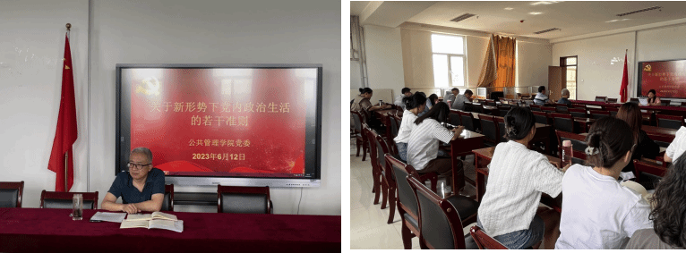会议第一个议程,各党支部就换届后工作开展情况作交流汇报。行政管理系党支部书记刘汉超讲到:“根据学校主题教育要求,我们支部近期开展了三次集中学习,学习了党的二十大精神、中国共产党章程等内容,同时进行线上线下交流研讨并撰写心得体会。”接着各党支部书记分别从支部建设、党员发展工作、“三会一课”制度的落实以及主题教育的开展等方面做出汇报。部军书记对各支部近期工作表示肯定,但他提出,各支部仍需进一步加强认识,严肃开展党务工作,支部是党的最基层组织,要将党的一切工作具体到支部,明晰工作职责,认清主职主业,克服一切困难,创造性地开展工作。会议第二个议程,由王琼老师带领大家共同学习《关于新形势下党内政治生活的若干准则》。王琼老师从《准则》的十二个方面详细地进行解读,她强调:“作为党员,要做到坚定理想信念、坚持党的基本路线、严明组织纪律、保持廉政本色等准则,今天,我们共同的学习与思考,将引领我们在思想认识上持续深化,在实践行动上更加有序规范。”部军书记紧接着谈到,我们要深刻认识《准则》的重要性,挺直腰杆,严格遵照《准则》开展工作,他提议各支部要以《准则》为主题开展一次集中学习,坚持“三会一课”制度、民主生活会与组织生活会制度与谈心谈话制度,以确保支部工作的有序开展。