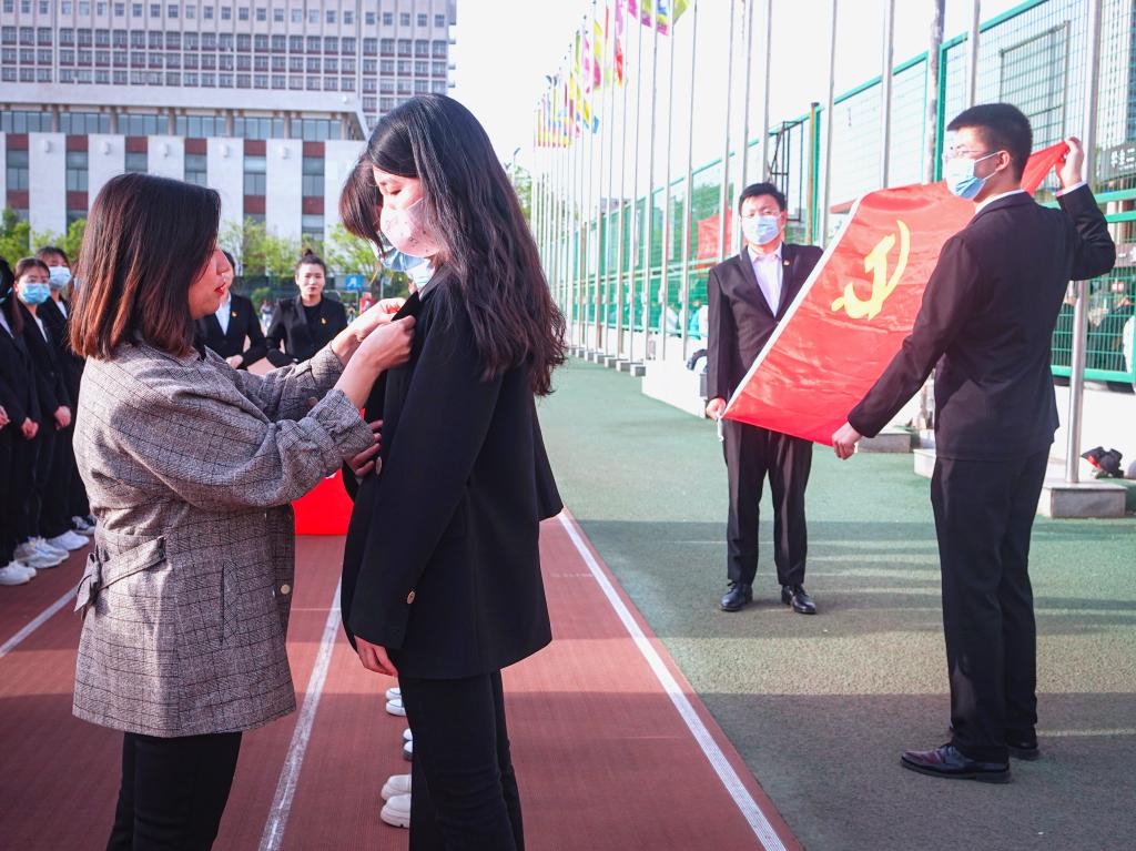 团委书记王琼带领在场党员重温入党誓词,大家紧握右拳,真挚地表达了对党的忠诚热爱和为共产主义奋斗终身的决心。随后,王老师为新发展党员佩戴党员徽章,并寄语:新的身份新的起点,不仅要组织上入党,更要思想和行动上入党,要时刻保持党员的先进性,坚持学习文化知识,不断提升理论素养,主动作为,乐于奉献,争做祖国合格的建设者和接班人。